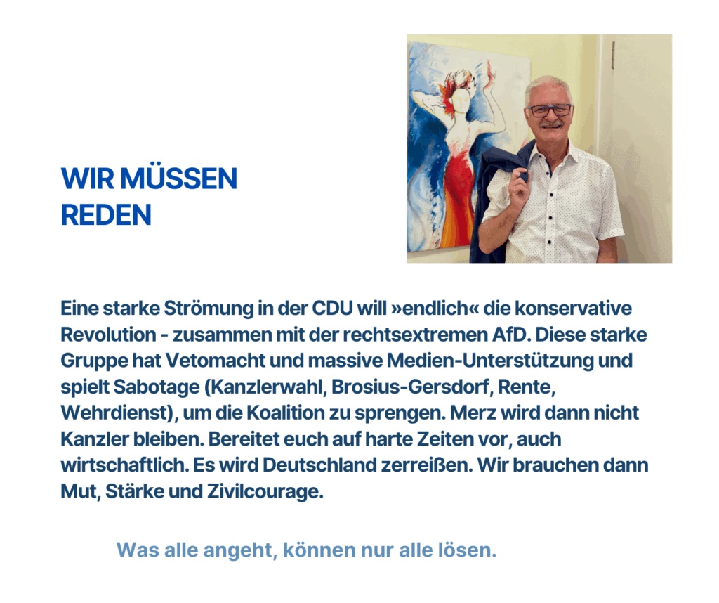 Eine starke Strömung in der CDU will »endlich« die konservative Wende (Revolution) – wohl gern oder notgedrungen auch zusammen mit der rechtsextremen AfD. Diese starke Gruppe in der Union hat Vetomacht und massive Medien-Unterstützung und spielt Sabotage (gescheiterte Kanzlerwahl im ersten Durchgang, Brosius-Gersdorf, Rente, Wehrdienst), um die Koalition zu sprengen.